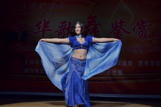 本晚的歌舞会由艺术学院冬岚副教授声乐小组承办。现任职于中山大学教育学院的舒乐是声乐小组08级的毕业生。她受邀献唱了京剧《贵妃醉酒》,生动再现了杨贵妃骄纵任性的性格。京剧配上钢琴,更是别有一番韵味。现继续教育学院教师,小组毕业生李雪则配合着中东风格的音乐节奏,带来动感十足的肚皮舞《东方雅韵》。
