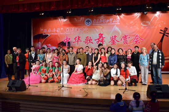 本网讯 “五十六个民族,五十六枝花。”一方水土一方文化。12月15日晚,北校区六教报告厅上演了一场别开生面的中华歌舞鉴赏会。该音乐会是我校对外教开展的首场“服务外教”系列之首场艺术活动。副校长方凡泉、许国彬,组织部部长方迎生,人事处处长阳爱民,教师发展中心主任谢文新,以及30多位外籍教师出席了音乐会。