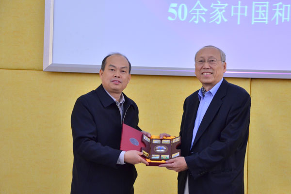 讲座前卢景辉代表我校向康荣平颁发纪念品