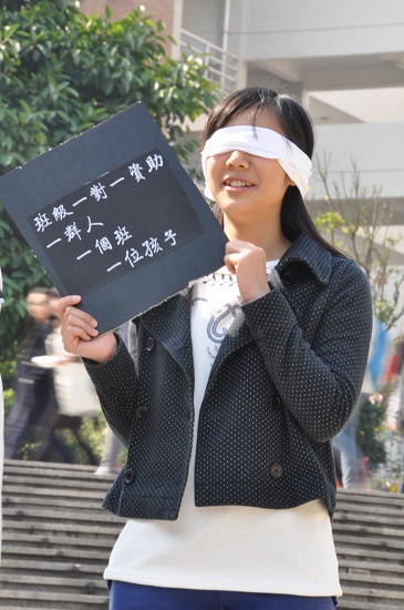 “蒙眼人”宣传“一对一”助学金项目