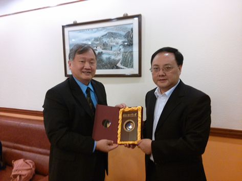 本网讯 11月27日上午,以“反垄断法”为主题的讲座在南校区大模拟法庭举行。台湾高雄公法研究中心主任、高雄大学法律学系教授纪振清作为主讲人前来交流讲学。我校副校长石佑启会见了纪振清,双方就合作办学、学生交流、学术交流等交换了意见并互赠纪念品。