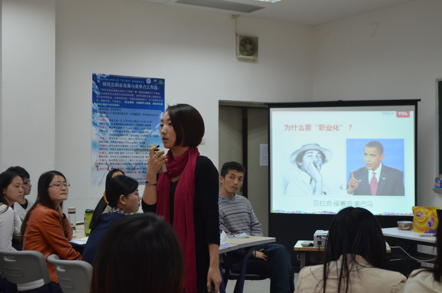 本网讯 11月17日下午,由学生就业指导中心主办,校研究生会承办的“研究生职业发展与竞争力工作坊”课程在南校区学生活动中心举行。首次课程由广外校友、现任TCL多媒体海外业务本部人力资源部高级经理彭妍漪女士主讲《职业人的一天》。