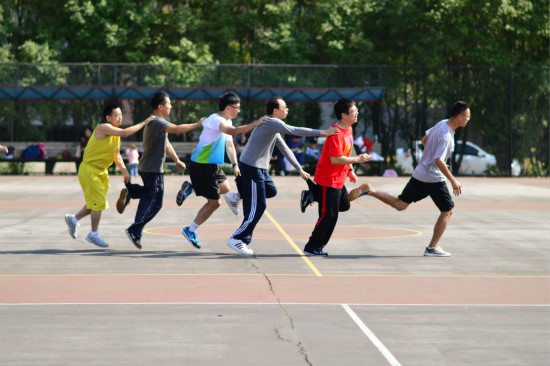 “红旗飘飘”,“绑腿跑”,“鸳鸯背瓜”,“单脚火车跑”…趣味运动会碰上了兴致勃勃的教工们,篮球场也沉浸在欢声笑语中。