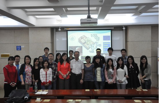 此外,Heiduk还在“欧洲论坛”分别作了“欧盟对华反倾销问题”和“欧洲福利国家与老龄化人口问题”两期演讲。在“欧盟对华反倾销问题”讲座中,Heiduk通过统计数据和图表详细解释了反倾销概念,并重点讲解了WTO解决争端的机制和程序,通过真实具体的数据和例子揭示反倾销问题的实质。关于欧洲福利国家与老龄化人口问题,他将欧洲福利国家分为八类并进行对比,通过例证解释欧盟内部福利政策的和谐度,最终得出欧盟福利政策逐渐步入规范化的结论。详细、生动、严谨的讲解使在座的欧洲学硕博点师生获益匪浅,对欧盟反倾销问题和欧洲的福利国家制度有了更加深入的了解。