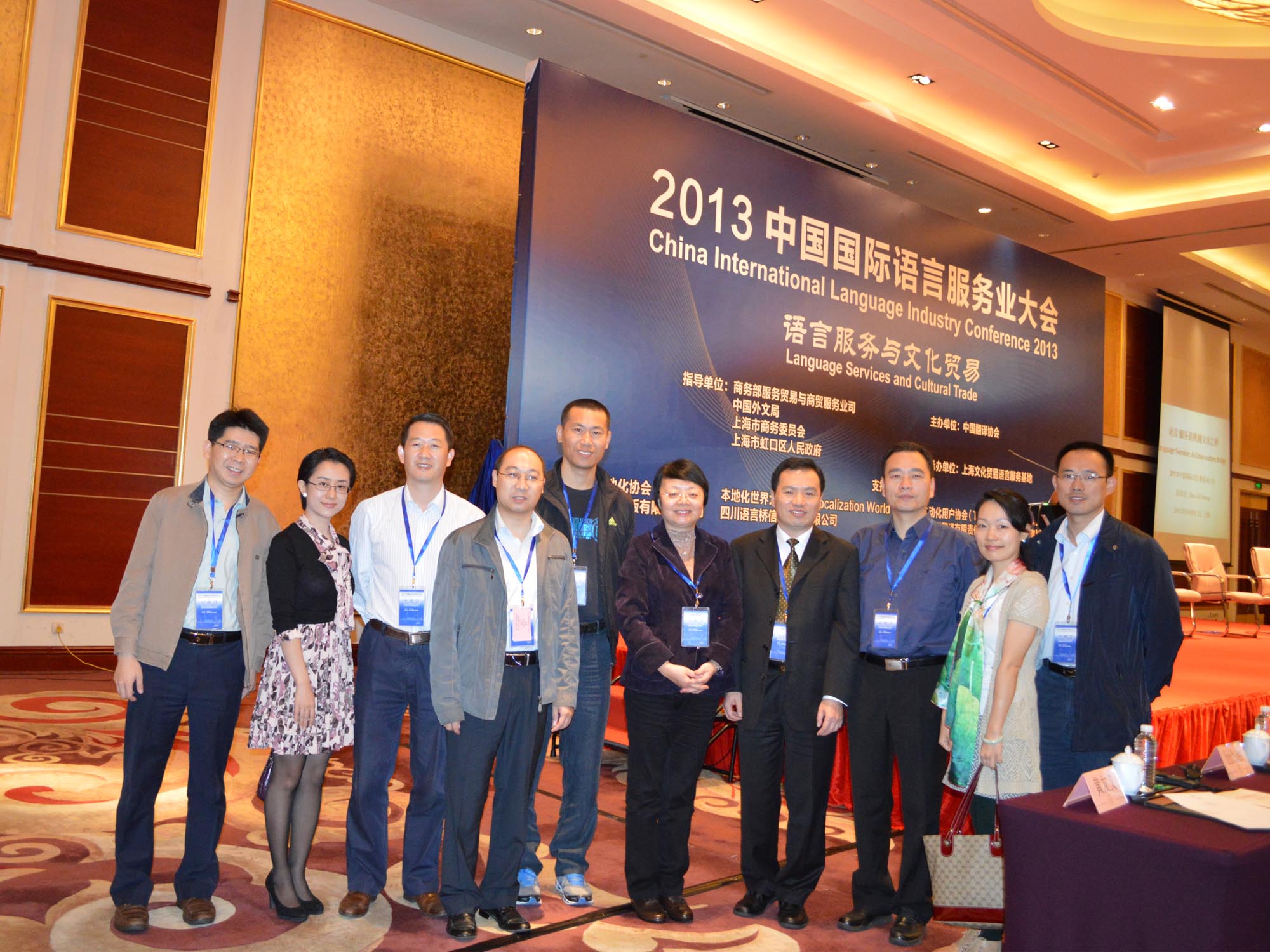 我校参会代表合影 语言服务与文化贸易 大会由中国翻译协会主办,上海文化贸易语言服务基地承办,以“语言服务与文化贸易”为主题,旨在探讨语言服务作为一项基础性服务如何更好地推动我国对外贸易、特别是对外文化贸易的发展,进一步提升我国的文化影响力和国际形象。
