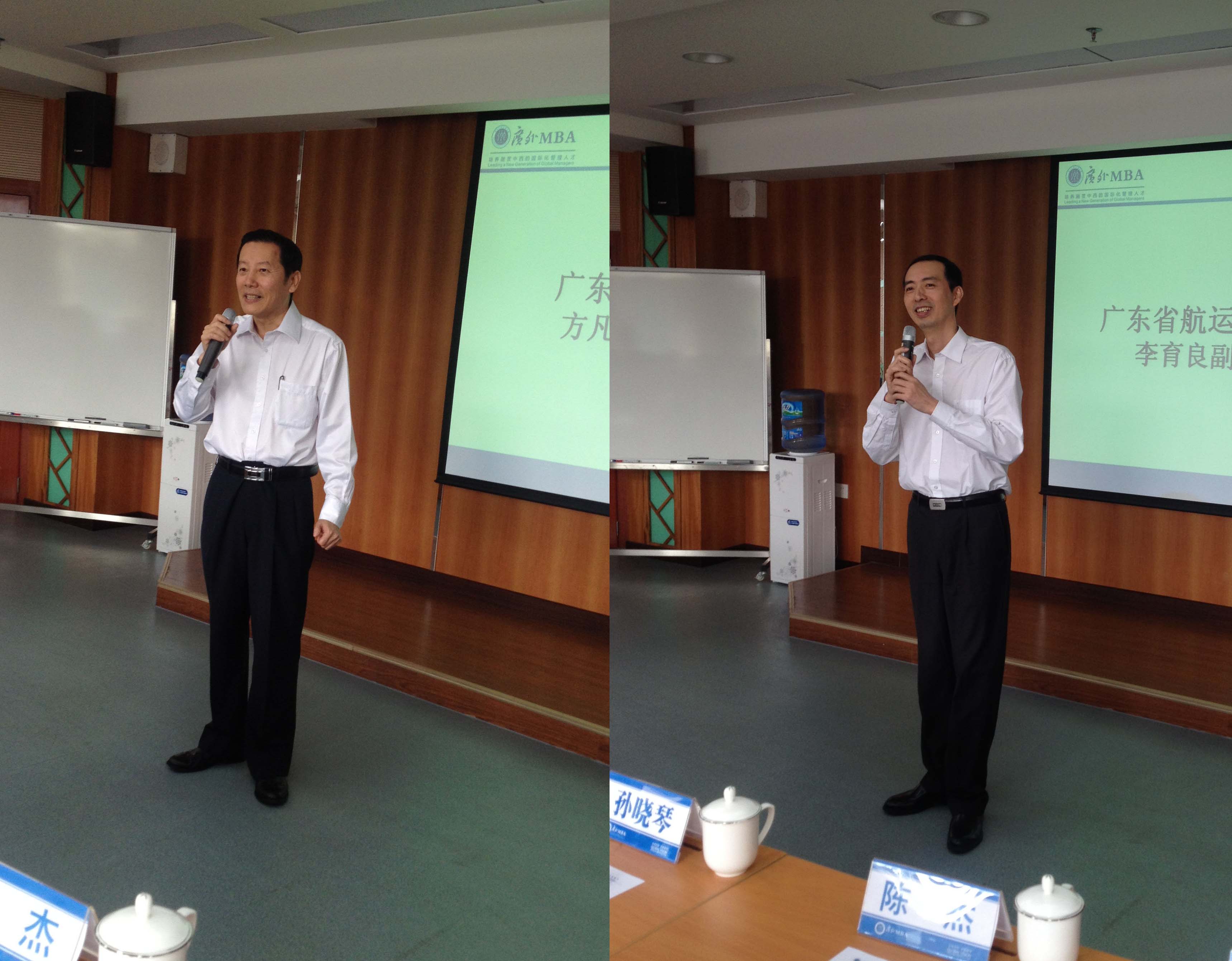 方凡泉首先代表我校对人才培训班的学员们表示了热烈的欢迎,简要的介绍了我校以及MBA学院的情况,并给学员们传授了“脸皮厚、多交流、多请教”等英语学习的真经。随后,广东省航运集团有限公司李育良副总经理介绍了此次培训是为集团“提前播种”,并非常幽默的鼓励学员们学有所成,学有所获。最后,学员代表梁晓丹用英文发言,感谢集团给予这次学习的机会并表态不会负集团所托,努力学习。
