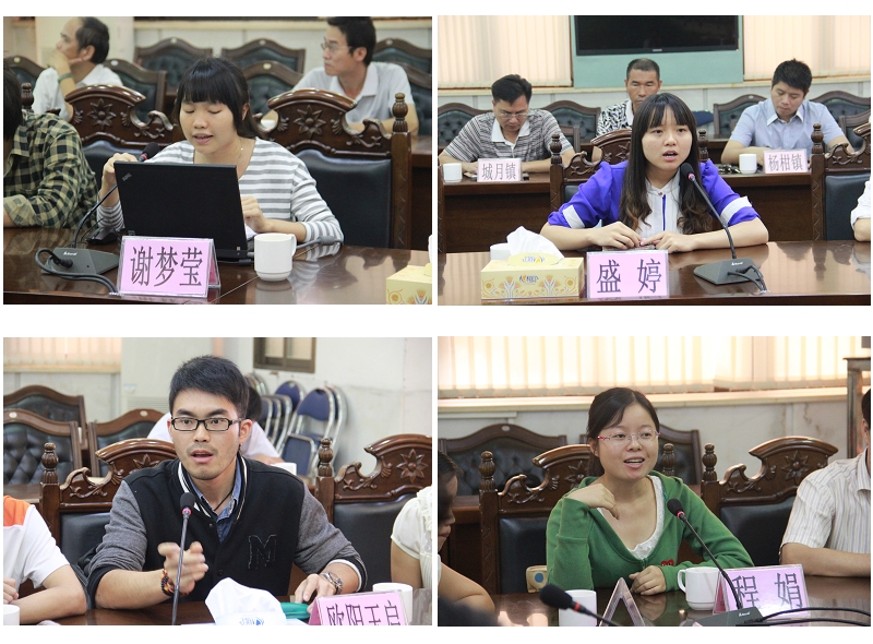 座谈会上,研究生挂职代表谢梦莹首先做了总结性的工作汇报,她认为为期三个月的挂职工作中学校和遂溪县安排周到、同学们在充实繁忙的工作中,体验了艰苦和温暖,收获了磨砺和成长,增长了毅力和智慧。她总结了四点收获。一是清晰地体会到中国农村的社情民意;二是深刻认识到基层工作繁琐复杂,也被基层工作人员的敬业和付出所感动;三是学会了积极沟通,待人接物,团结合作;四是扩展了视野和视角,学会用矛盾的眼光看问题,发展的观点去思考。十名挂职研究生纷纷畅谈自己在挂职实习期间的所见所闻,汇报了自己在三个月的镇长助理工作的收获和体会,并就遂溪工业园区定位、产业集聚,农产品品牌打造,引进高层次人才及电子政务等方面提出了建议。