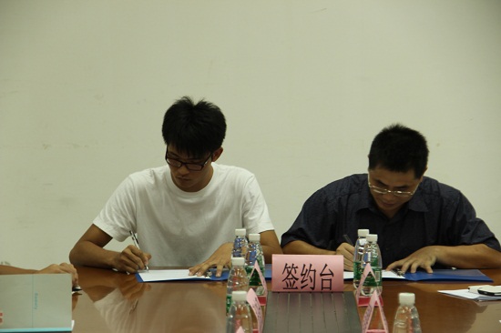 支部书记(左陈广豪、右黄石胜)在签署结对共建协议在仪式上,黄石胜与陈广豪签署了结对共建协议书,两个支部将在“读书交流会”、支部建设、企业参观、就业指导和创业教育、校园招聘会和宣讲会、党员就业服务队、就业工作信息化建设等方面展开结对共建活动。