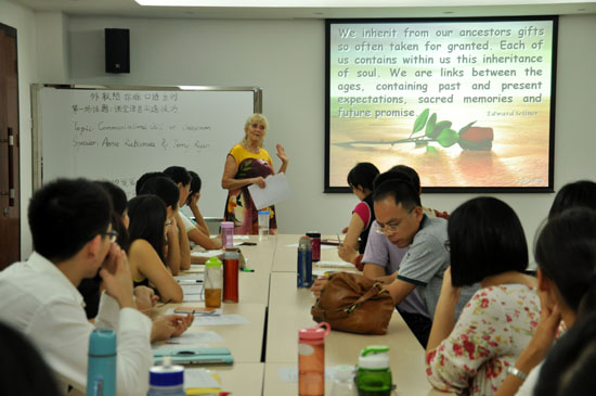 本网讯 10月11日下午,我校首场“外教陪你练口语”系列活动——课堂语言沟通技巧在北校区云山A座教师发展中心开展。该系列活动面向我校全体教职工,邀请外籍教师任课,旨在创造一个良好的英语互动交流氛围,强化我校教职工英语听说能力和口语表达能力的培养。