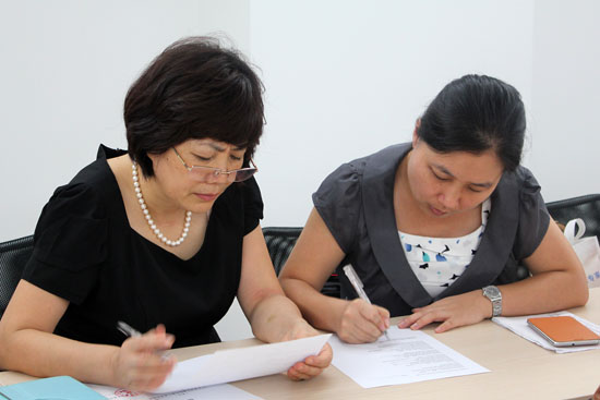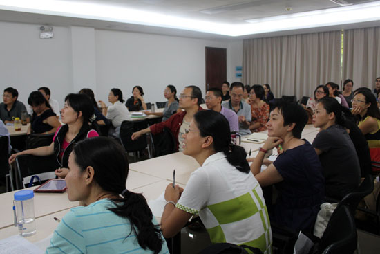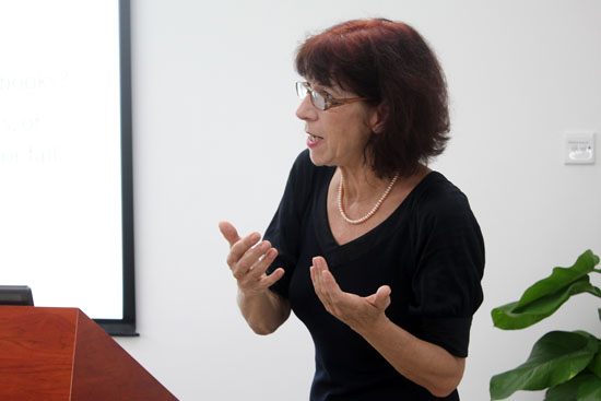 另一外教Annie Rubienska则首先明确了交流过程中传送者和接收者的关系,强调“谁和谁交流”、“交流什么”、“用什么方式”、“交流的目的”和“是否有回应”等因素的重要性。为了让大家更清楚不同教学方式在教学中的作用,她还临场表演了“dialogue(对话)”和“dogma(教条)”两种英语教学方式,她时而严肃时而温柔的表演将教学课堂气氛推向高潮。此外,她表示中国学生与外国学生相比,在学习过程中并不十分主动,有时需要老师们“撬”开他们的口。“‘老师说,学生听’的课堂模式是灾难。” Annie Rubienska希望学生、老师和课堂都是活跃的。