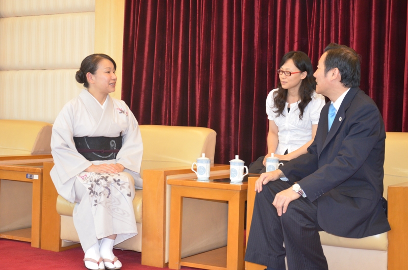 本网讯 9月23日,在我校日本茶道室从事了三年茶道教学的首任教师村内伦子离任回国。我校副校长方凡泉前来为村内伦子送行。