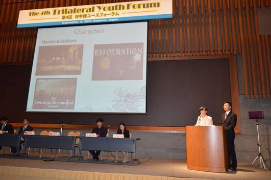 本网讯 2013年9月16日-20日,第四届中日韩青年论坛在日本札幌大学举行。中国联合国协会会长卢树民率中国联协代表团出席。我校翻译学院学生2012级硕士生张骜、陈小虎及2011级本科生秦娜作为中方代表出席。
