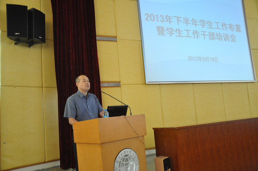 本网讯 为全面落实新学期各项工作,9月18日上午,2013年下半年学生工作布置会暨学生工作干部培训会在南校区八角楼会议室召开。校党委副书记卢景辉,学生工作部(处)、校团委、就业指导中心全体人员,各学院学生工作负责人及全体辅导员参加了会议。会议由学生工作部(处)长植秀聪主持。