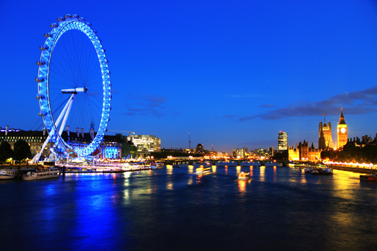 伦敦中心的夜晚色彩斑斓,将泰晤士河也映照得灿烂