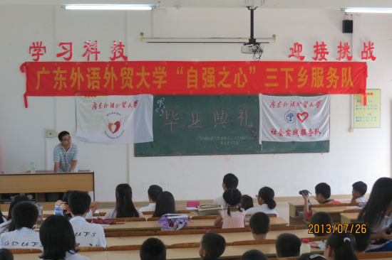 本网讯 7月26日,是“自强之心”服务队三下乡的最后一天,毕业典礼暨文艺汇演也在这一天举行,我校学生处老师毕建永、黄坌老区学校教导主任麦素洁出席了本次典礼,全体队员和七十余名学生参加了本次毕业典礼。