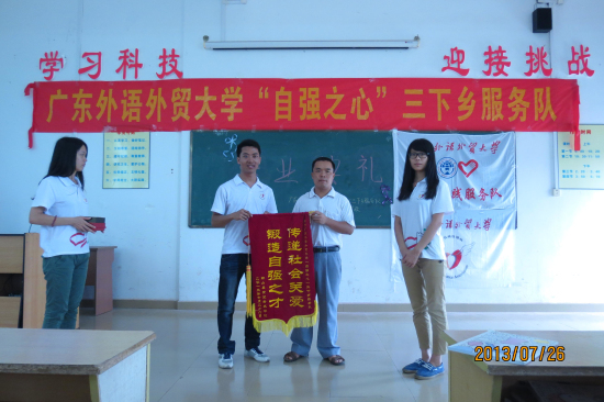 随后,队长向黄坌老区学校赠送印有广外校徽和校训的纪念品,麦素洁则向我校自强社赠送印有自强社宗旨“传递社会关爱,锻造自强之才”的锦旗。义教组组长冼慧敏作为教员代表发言,句句饱含着对孩子们的爱和不舍,大家不禁热泪盈眶。
