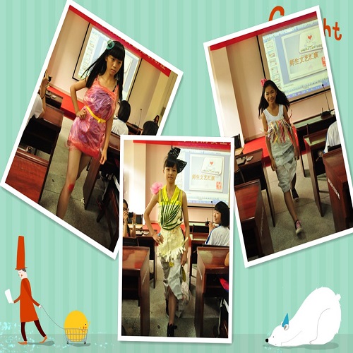 学生节目表演正式开始。第一个节目,也是准备时间最长的节目——环保时装秀。A、B两个班的学生分成14个组,每个小组在组内选出一名模特,穿上由组员们一起设计制作的衣服走T台秀,这些服装的材料都是由报纸、塑料袋、气球、甚至是竹叶组成,却被学生们巧妙的搭配在一起,完美的呈现在眼前。