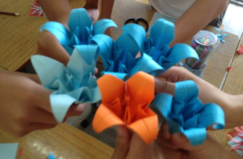 当折出美丽的手工百合花后,小朋友们纷纷在百合花上签上自己的名字,送给自己喜爱的老师。课程结束时,老师们抱着手中的一大堆礼物,欣喜而又感动,教授手工课的队员吴燕玲感慨道“自己剪的一百朵花,都不及他们送我的一朵”。