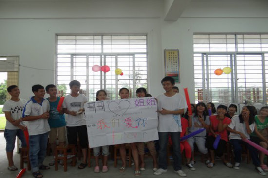 随后,一班和二班的同学轮流上阵、用动听的歌声唱出他们对支教老师的感谢。一班同学一首《没有什么不同》以其真挚的感情赢得了全场的掌声。现场气氛火热,一班同学还在歌曲最后献出了一张由全班同学联手制作的画,送给老师作为彼此最后的留念。班长戴婷婷还动情地说道,“是老师带给了我们欢乐、教会我们没有追求和付出便得不到成功,谢谢你们,我们爱你们。”