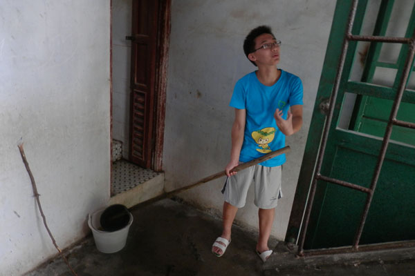 来到基地的第四天,就传来二楼的厕所堵塞的消息,谢怀安赶到现场,楼梯口早是污秽满地。在校长夫人的指导下,怀安提着小水桶和铲子,在四个男同胞的陪同下开始了挑粪工作。挑了数十桶后仍不见效,校长夫人提出改用拖把直接深入吸取的建议,还戏言要小心点可能会溅到脸上。强掩内心的恐惧,怀安索性赤膊上阵,并强力阻止笔者进行拍摄。回忆起当天的情形,他不停地说:“唯一的感受就是好恶心啊。我今天洗了三次澡,每次都用不同的沐浴露,所以大家可以放心。”看到他的洒脱,我们不由得惊叹眼前这个二十出头的小伙子内心埋藏的强大小宇宙。