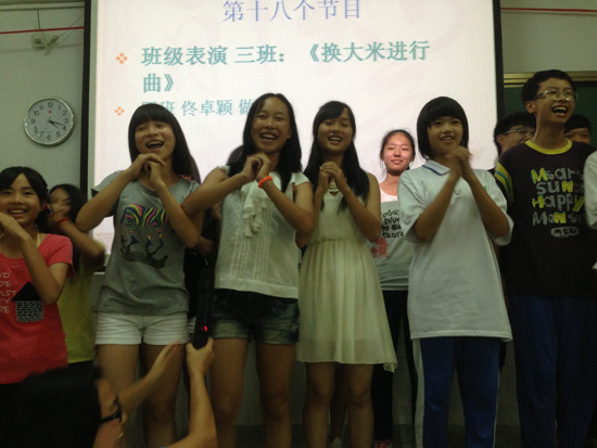 而班级集体表演部分,三班的《换大米进行曲》则是赢得最多喝彩声的节目。前些年流行于网络的歌曲搞笑串烧在21位同学的演绎中又呈现了另一番风味,惹得台下的观众和评委哈哈大笑并纷纷举起拇指,表演完毕后同学们还特地对辛苦地帮助他们选歌及排练的音乐老师表达了感谢与喜爱,并为老师献上花朵。