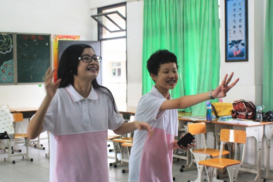 再看一下二班,他们围成U型,一位男生在人群中央唱歌,即使声音略显稚嫩,音调也不甚准确,他还是眯着眼,无比陶醉地唱着。同学们打着节拍应和着。五班则在“抢板凳”:悠扬的曲子在教室里萦绕,班主任也跟学生一起,绕着椅子,一步一步,小心翼翼地走着。忽然,音乐戛然而止,刷的一声,大家都坐下了,一名女生没反应过来,还傻傻地站着,一脸愕然。