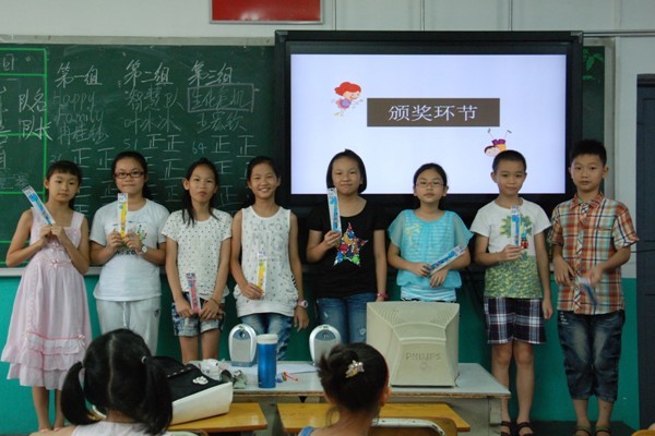 一年级的比赛形式以玩游戏换取礼品为主,三四年级的知识竞赛分为单词填填看、有问必答以及我抢答我快乐三部分。各班级分为三支队伍进行比赛,同学们为各自的队伍起了如智慧队,Blue Sky队等各具特色的队名。主持人按照PPT的题目依序向学生提问,学生积极举手抢答,经过队内交流、合作得到最终答案。赛场内学生积极思考,热烈争论,其乐融融,老师们都看在眼里,喜在心头。