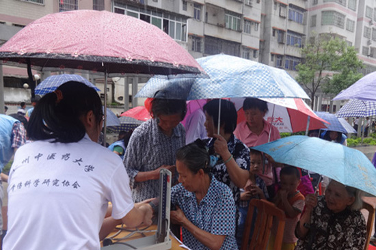 布置完成后,义诊活动如火如荼地进行。量血压的摊位前,人潮涌动,“小医生们”熟练地使用量血压仪器,并耐心地向居民讲解高血压知识及注意事项。为居民做艾灸的队员单膝跪地,全然不顾身体疲劳,居民们由衷地竖起了大拇指。按摩推拿服务也较受欢迎,摊位前的十多张椅子坐满了人,队员不时询问老人推拿力度是否合适。负责健康咨询的队员们认真地为居民宣传健康保健知识,并送上健康小册子。天公不作美,10点下起了阵雨,但居民热情不减,仍撑着伞有序地排队等候。