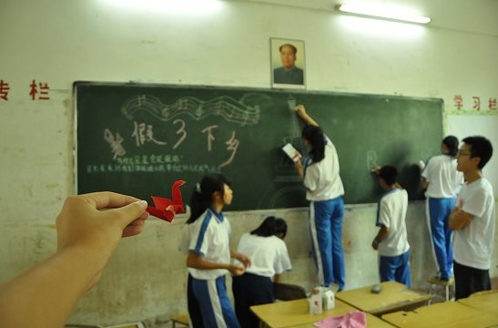B班的同学们则在黑板报上特别下功夫。其中一个版面是“广东外语外贸大学招生啦”,端正的粉笔字写着“还担心这个暑假过得枯燥无味么,追梦人来啦;还担心口才不好么,脸哥驾到;还愁历史学不会,劲兄来了;还想在找音乐知音么,泽帆哥哥带你唱;还怕语文科无聊么,舒琪学姐很有趣;英语大师KIKI来教你哩,期待么;还说地理呆板么,嘉荣师兄带你玩;浪漫法语很遥远,禹锡碧君来教你”。配图是字母A和B手牵手,这也体现了两个班的同学们希望互交朋友、打成一片的愿望。