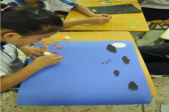 第一节课上老师向学生们介绍了“交换空间”活动。同学们自由组合成7组,每组5-6人,他们热烈讨论装饰的课室区域及装饰的方式,并选出小组长发言,说出本组的创意点子。点子相同的组则由组长发表“竞选宣言”,简述本组的装饰创意,由全班同学投票,票多者获得该区域的装饰权。“落选”的组重新选择装饰区域。各组确定装饰区域后,讨论所需材料及工具,组长分配各组员任务。