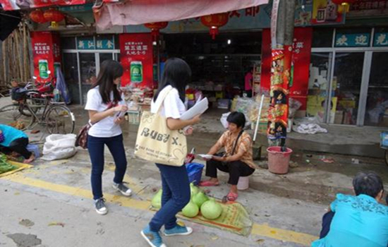 由于7月18日是镇上赶集的时间,所以摊位和行人特别多,场面十分热闹,为队伍宣传工作的顺利进行提供有利条件。队伍一共要派发300多张传单,8位队员以小组为单位派发传单。