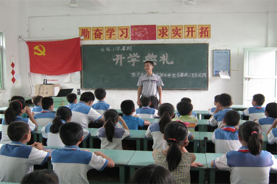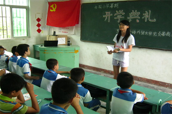 本网讯 7月15日上午,西语学院首支党员队伍“小太阳”志愿服务队在汕尾市城区香洲街道西联小学召开了开学典礼。典礼由“小太阳”服务队队员戴菊颖主持,莅临本次典礼的有汕尾市西联小学校长余国鹏、当地村委负责人及热心于教育的居民。下午,汕尾市城区教育局局长林泽树及村委主任莅临教学基地进行巡视。