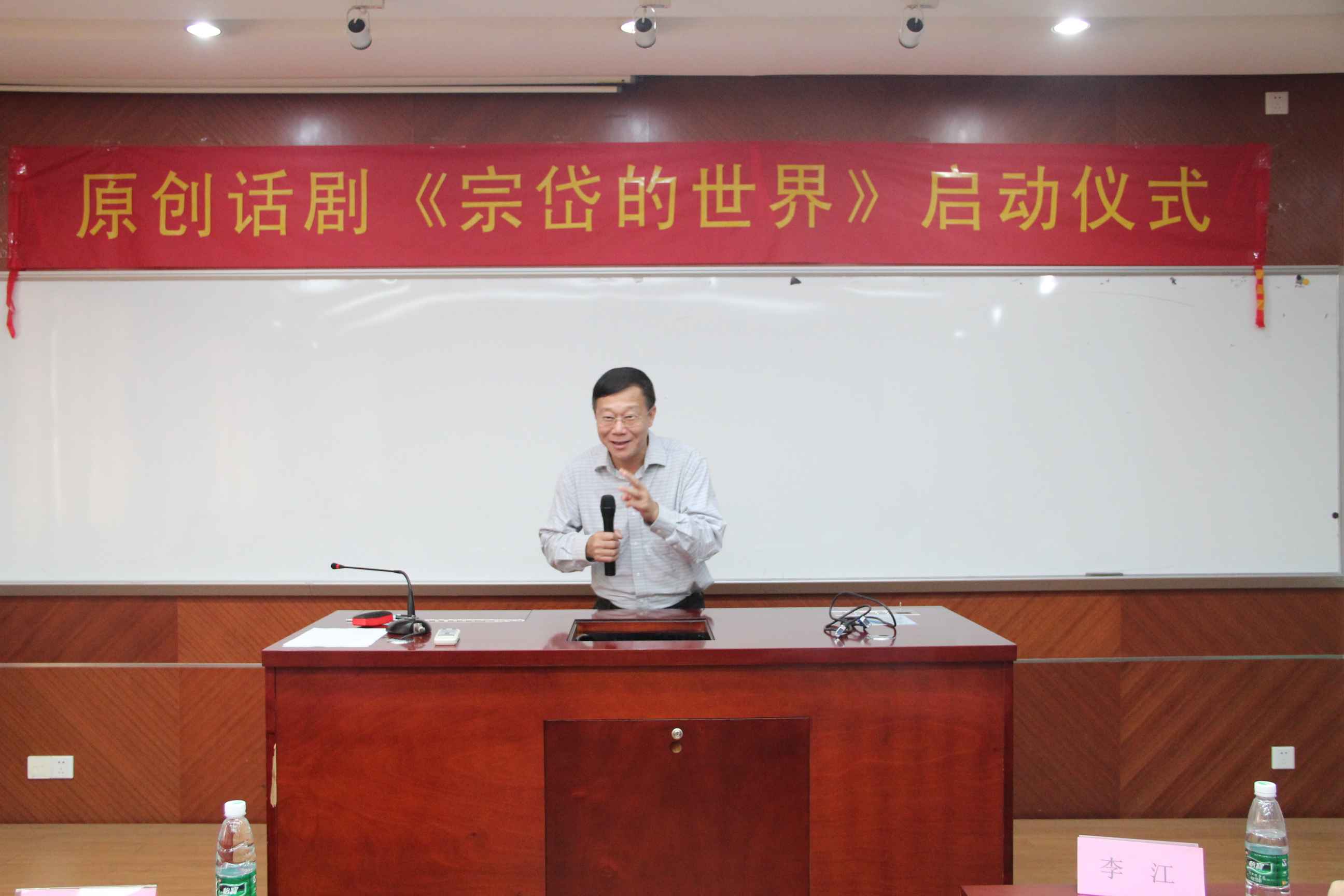 陈建平致辞中,祝贺经过层层选拔入选剧组的学生演职员们,希望他们能通过这一原创话剧精心演绎诠释梁宗岱先生的世界。他回顾了梁宗岱先生在广外的生活片断,要求话剧主创团队将梁宗岱先生身上具有的广外人的拼搏精神传递给每一位观众,致力于把这一原创话剧打造成为广外的经典和精品。随后,陈建平宣布我校大型原创话剧《宗岱的世界》正式启动。