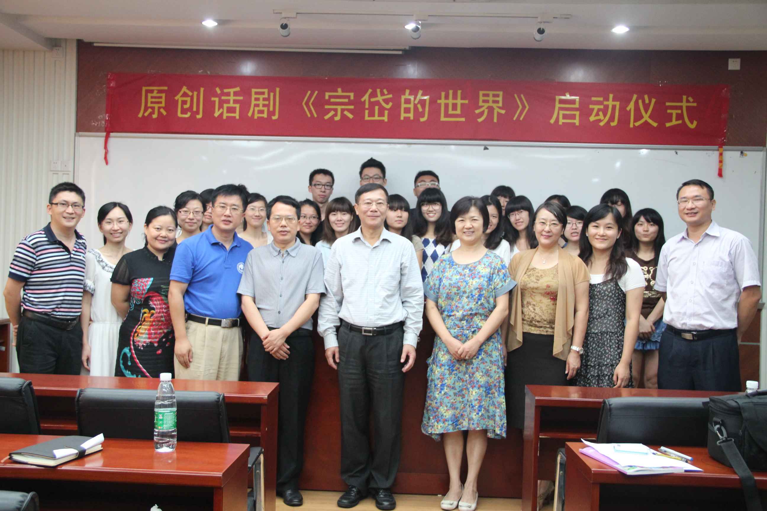 本网讯 为纪念著名诗人、翻译家、理论家梁宗岱先生诞辰110周年,由学校党委宣传部主办、中文学院承办的广外首部原创大型话剧《宗岱的世界》于7月13日正式启动。校党委副书记陈建平,宣传部部长胡文涛、副部长陈红霞,中文学院党委书记李和民,话剧总负责人刘海玲,话剧艺术指导、原广州军区战士话剧团导演孙砚娥,话剧团队指导老师胡颖华参加了此次启动仪式。启动仪式由中文学院党委副书记李江主持。