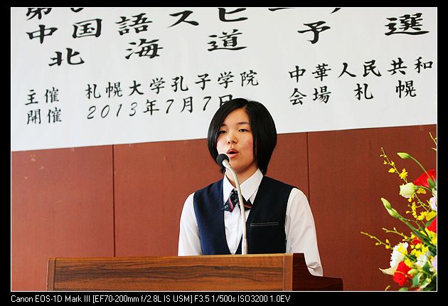 获得一等奖的是札幌国际信息高中的长谷川同学,她从小学4年级就开始学习中文,在札幌是一个很难得的小中文爱好者。她演讲的题目是“我和中国文化”。讲述了自己去中国总领事馆观看北京奥运会开幕式的经历,崛起的中国让她振奋,从此她与中国、中国文化结下不解之缘。