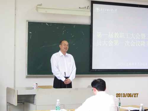 卢景辉首先对大会的召开致以热烈的祝贺。他对学院建院以来所取得的丰硕成果以及学院领导班子和全体教职工的辛勤努力予以充分肯定。关于学院下一步的发展,卢景辉从“民主治院、制度管理、科学发展”三个方面对学院的工作提出具体要求,勉励全院教师要继续发扬艰苦奋斗的创业精神,支持学院的各项工作,推动学院教学、科研、社会服务以及文化传承创新等工作迈向更高台阶。