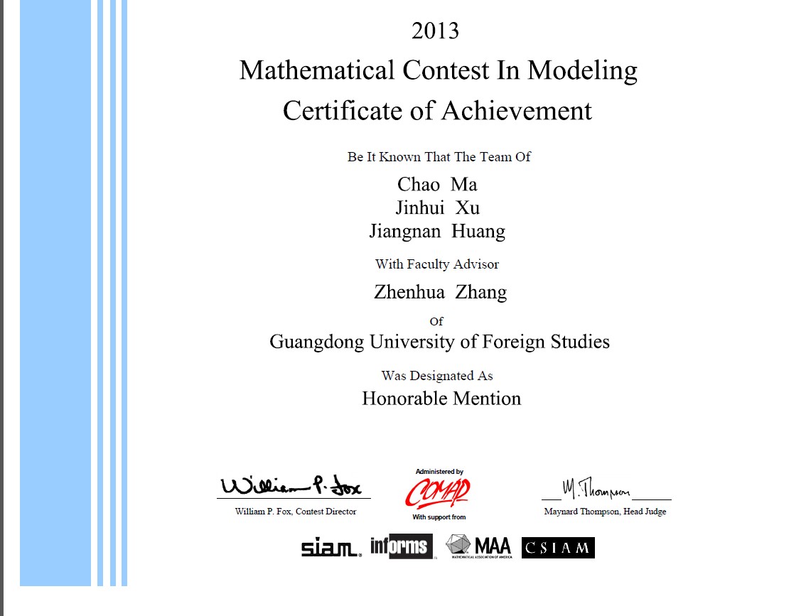 作为数学建模领域内的国际最权威赛事,比赛不仅要求参赛者具有运用数学模型解决跨学科问题的能力,同时对学生的专业英语阅读与写作水平和利用计算机处理大批量信息的能力也有着更高的要求。该赛事每年吸引了包括哈佛大学、麻省理工学院、牛津大学、剑桥大学、加州大学伯克利分校等世界著名学府的优秀学生参与角逐。