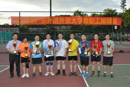 本网讯 6月22日下午,由校工会主办、体育部承办的2013年广东外语外贸大学教职工排球赛在北校区排球场圆满落幕。继教公开学院队、机关队和教育新闻队分别获得冠亚季军。