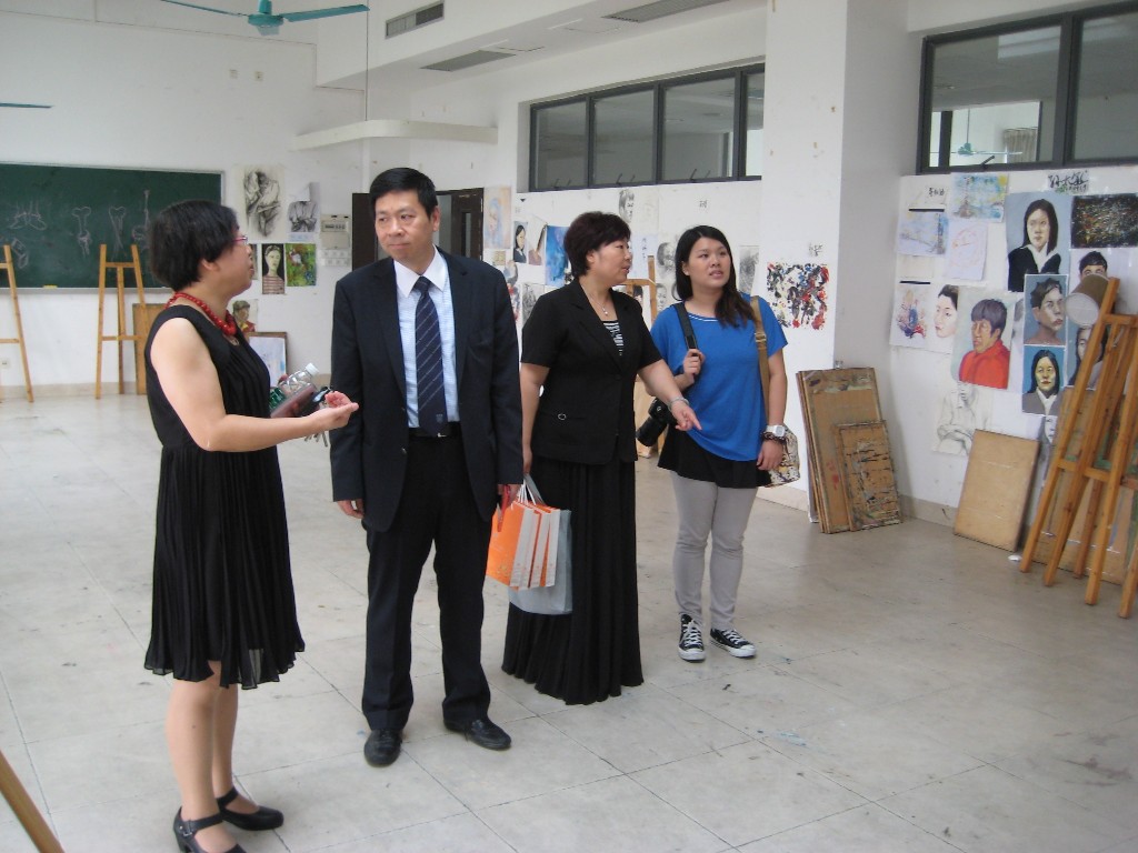 李焯坚等人参观艺术楼 据悉,此次交流活动旨在用艺术传播文化,用艺术传递情感,用艺术架起友谊的桥梁,展示了我校艺术学院的教学成果和不断寻求专业实践教学与实习基地平台建设的开发与合作。