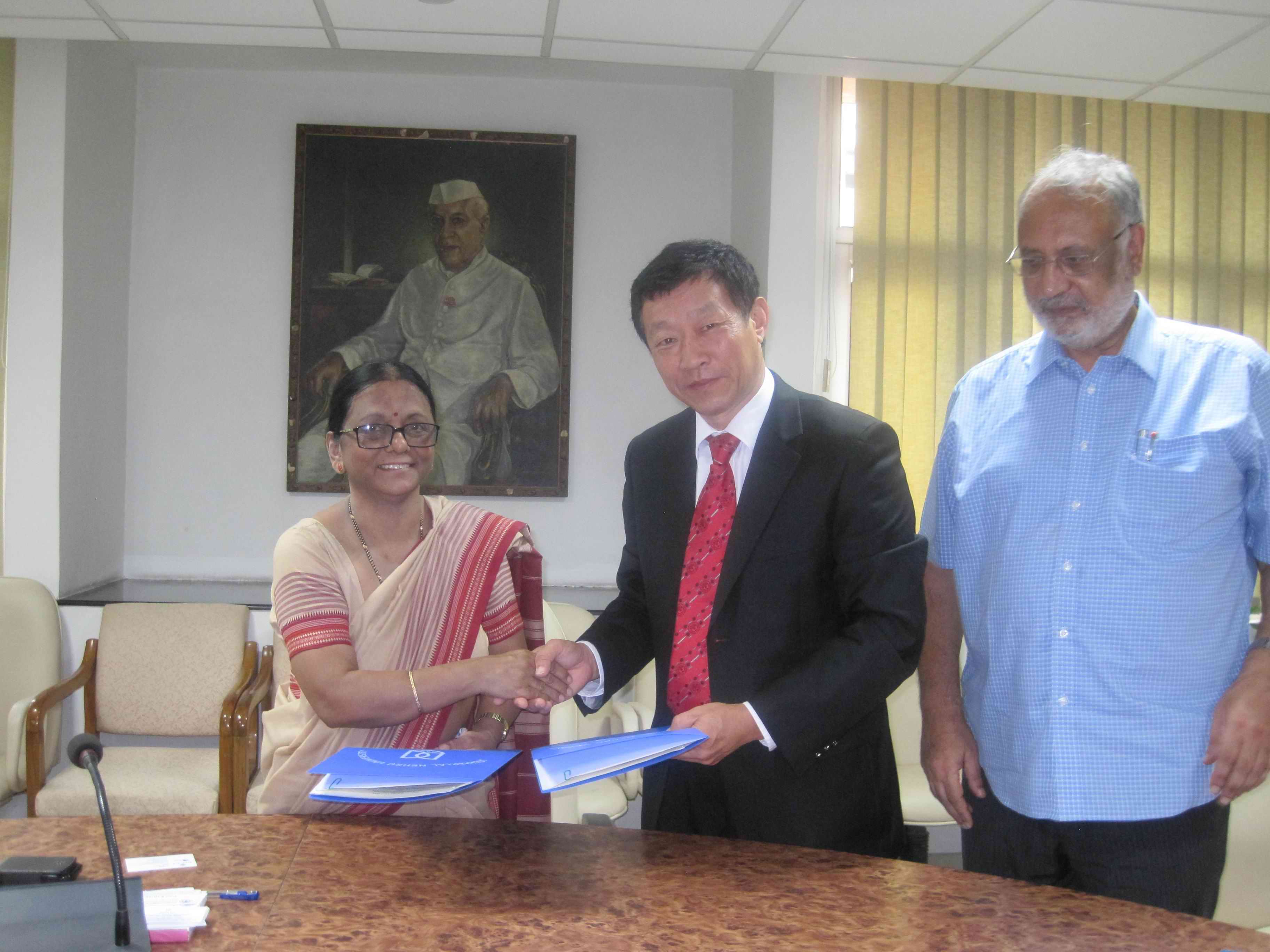 6月18日,许国彬访问了尼赫鲁大学。尼赫鲁大学校长苏塔·拜(Sudha Pai)欢迎许国彬一行的到来。尼赫鲁大学国际合作处首席顾问及区域发展研究中心哈尔吉特·辛格(Harjit Singh)、语言、文学与文化研究中心中国与东南亚研究院拉盖什·古马儿(Rakesh Kumar)、 加拿大、美国与拉美研究中心主任秦塔莫尼·玛哈伯德(Chintamani Mahapatra)等参加了会见。许国彬向尼赫鲁大学的领导和教授们介绍了我校的发展历史、学科门类、专业特色及社会影响等情况。双方在合作办学、学生交换、信息共享、合作研究等方面达成了多项共识,并就具体的合作项目进行了商议。随后,许国彬与苏塔·拜共同签署了两校合作协议。