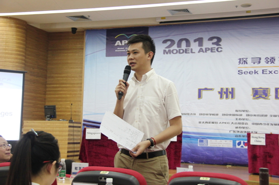 来自华师11级本科的乔山,她在本次大会中代表印度尼西亚发言。尽管专业是汉语言文学,但一口流利的美式英语和乐观开朗的笑容给她的印象着实加分不少:“I love challenges, that’s why I’m here”。在“Improving Women’s productivity”问题上,她从“objective”和“subjective”两方面阐述了应对措施:一是“help women to promote their competitiveness”,二是“guarantee women’s rights and cultivate a warm working atmosphere”,语速适中,有条有理。李柯是华工11级本科英语专业的学生,他代表的经济体是中国台北。第一次参赛的他因为紧张而一时口吃,但他随后表现出的坦然和雄心依然令人赞许不已:“I live by a code: meet the genius, read the book, and see the world.”。在“SME’s global competitiveness”问题上,他针对台北中小企业目前发展状况,别出心裁地提出一个“credit insurance fund”解决方案,细致具体地分析其必要性和可行性,逻辑清晰,思辨力强。