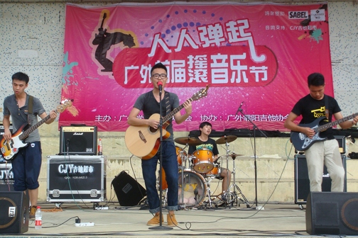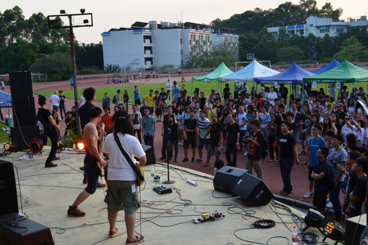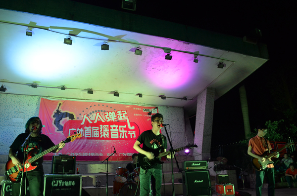 本网讯 6月1日,由我校霏阳吉他协会举办的“人人弹起”广外首届摇滚音乐节在北校区财院体育场上火爆登场。重量级乐队Stranger和Golden Cage、暗疮、太空人等广州一线乐队,以及华工、广工和我校等高校的乐队,共15支乐队参与本次活动。音乐节从下午场、指弹原潮区、Rocker歌词对对碰一直持续到晚场表演,在摇滚中呈现了一场震撼人心的音乐盛典。