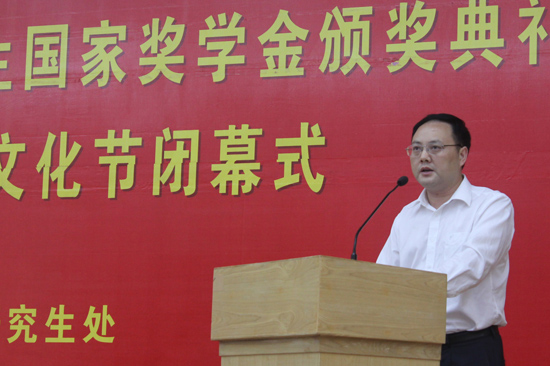 本网讯 5月30日,2011—2012学年度首次研究生国家奖学金颁奖典礼暨第八届研究生学术文化节闭幕式在北校区图书馆报告厅举行。副校长石佑启、研究生处处长袁泉、研究生工作部部长康为茂、研究生处副处长朱文忠及各研究生培养单位的领导、老师、研究生参加了活动。