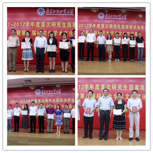 朱文忠宣读《关于表彰2011-2012学年度“研究生国家奖学金”获得者的决定》、《第八届研究生学术文化节优秀指导老师、优秀学生个人的名单》。石佑启和院领导为获奖研究生颁奖。