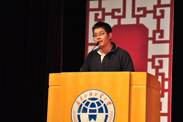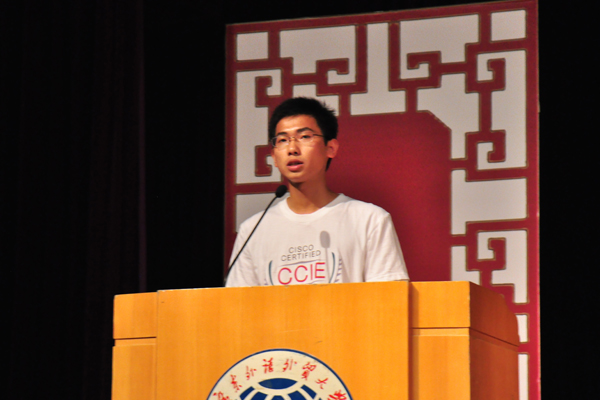 信息学院09级网络工程1班学生、CCIE证书获得者莫晓楠同学代表学员发言。他深有体会地说,CCIE之路是艰难的,全英语的试题,全英语的高技术实施,夜以继日的实训,终身难忘。扎实的学习过程及证书的含金量让他的职业生涯之路豁然开朗,自己也如愿获得许多优越的就业机会,他已经收到了广东省电信规划设计院等单位的Offer。