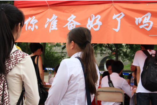 在“环球雅思“摊位,来自肇庆学院大三英语师范专业的孔庆杰正在面试。他们宿舍7点多就从学校出发,大概两个小时的路程到达这里。我校翻译学院大三学生叶丽雅告诉记者,“北校没有暑期招聘会,所以来南校找暑期的实习”。