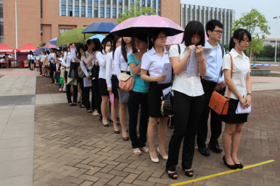 “交通银行”面试官最后确认共有350份简历,而仅能提供30个岗位。面对就业岗位供不应求,面试官表示“这在我们的意料之中”。另一家全球500强的“中国联通”和本土老牌企业“广州酒家”的摊位前也人满为患,至上午12点“中国联通”已招满,而“广州酒家”直到结束仍有几十人等候。