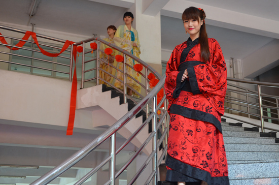 汉服秀是开幕式的一大亮点,广外模特队身着飘逸流畅、端庄典雅的各式汉服,为我们展现了古风古韵的民族风采:款式修身、长可曳地的曲裾深衣,雍正平和、优雅大方的对襟襦裙,飘逸灵动、大气自信的齐胸襦裙,典雅清新、古朴大方的袄裙。种类繁多,样式美丽的汉服承载着中国传统儒家思想的基本道德意义,追求天然由内到外的内涵之美,向人们诉说着三千多年古老的华夏礼仪文明。