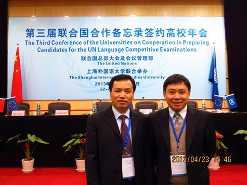 本网讯 2013年4月22至24日,由联合国总部大会及会议管理部(DGACM)主办的第三届联合国合作备忘录签约高校年会(The 3rd UN-MoU University Conference)在上海外国语大学举行。我校校长仲伟合以及高级翻译学院院长平洪、副院长詹成参加会议。