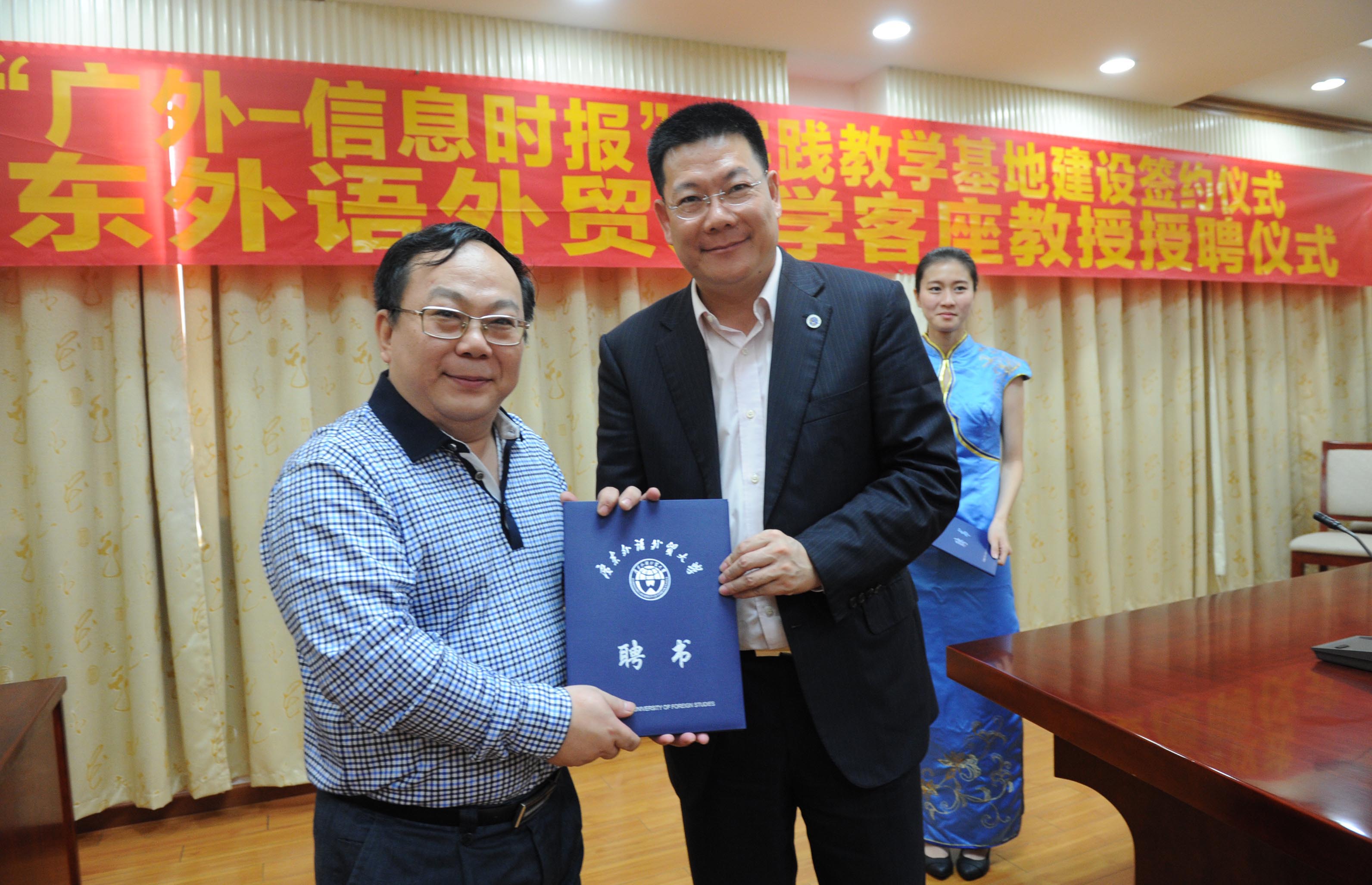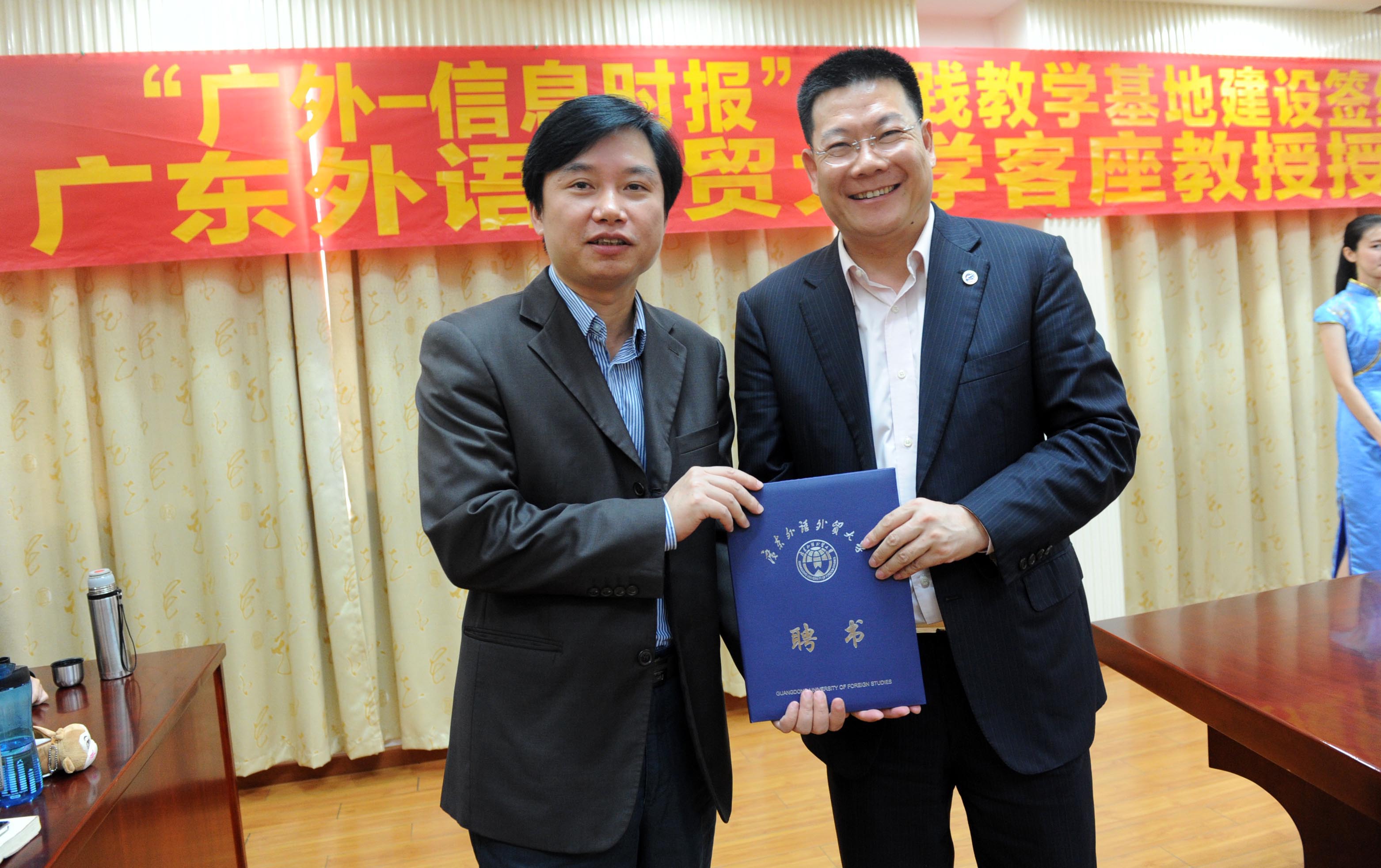 本网讯 “广外—信息时报”教学研究基地建设签约仪式暨广东外语外贸大学客座教授授聘仪式于4月23日举行。我校校长仲伟合为信息时报社社长钟华强、总编林明颁发了客座教授聘书。广外副校长陈德萍与信息时报副社长李信彰代表双方签订教学研究基地建设协议,信息时报正式成为广外教学研究基地。